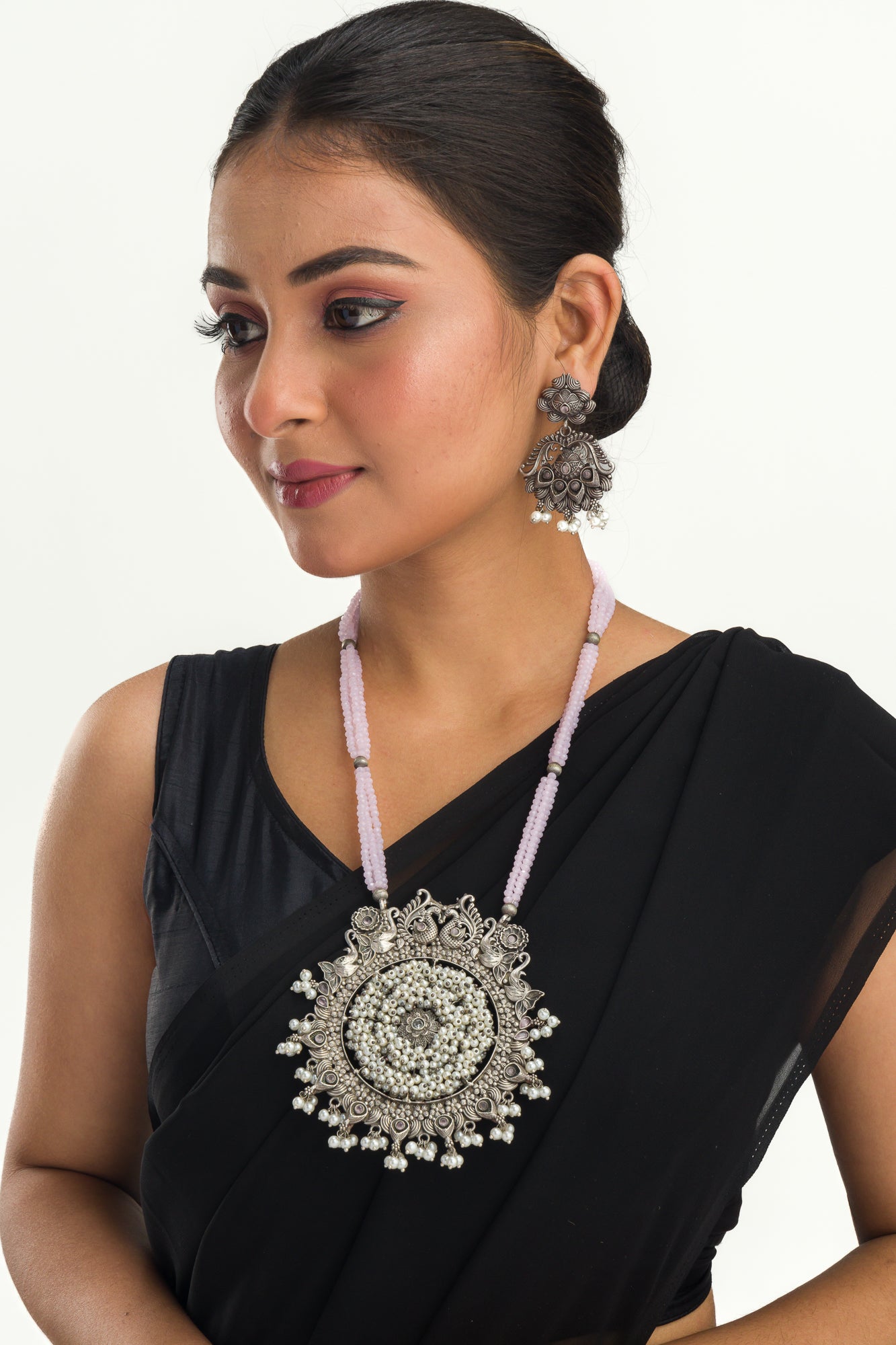 This long oxidized necklace features pink and white pearls, exuding vintage elegance. With its timeless design, it can add a touch of sophistication to any outfit.